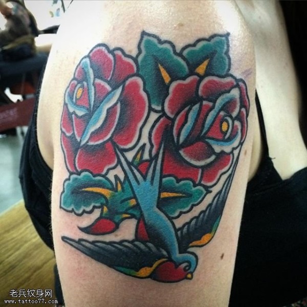 肩部的玫瑰燕子纹身图案