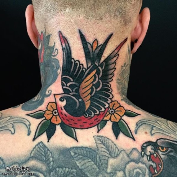 男人脖子彩色燕子刺青图案图片_脖子纹身图案大全_纹身图吧