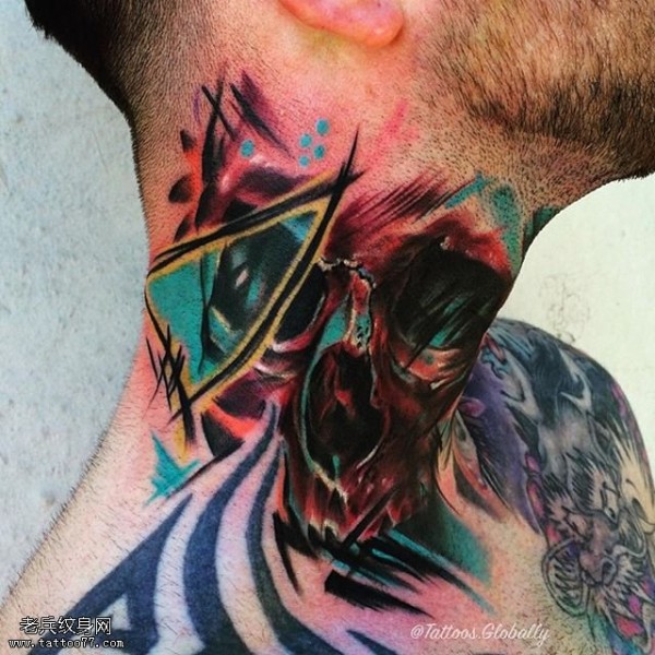 脖子上个性十足的彩色骷髅纹身_脖子纹身图案大全_纹身图吧