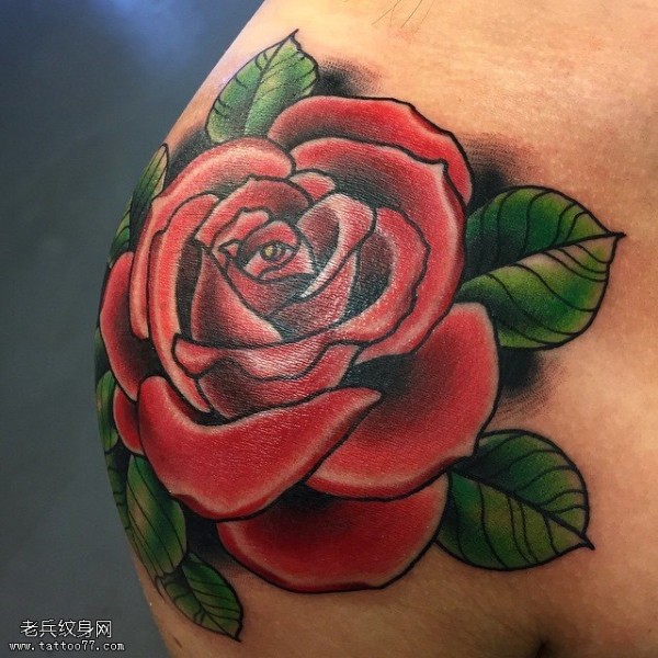 肩部的大红玫瑰纹身图案