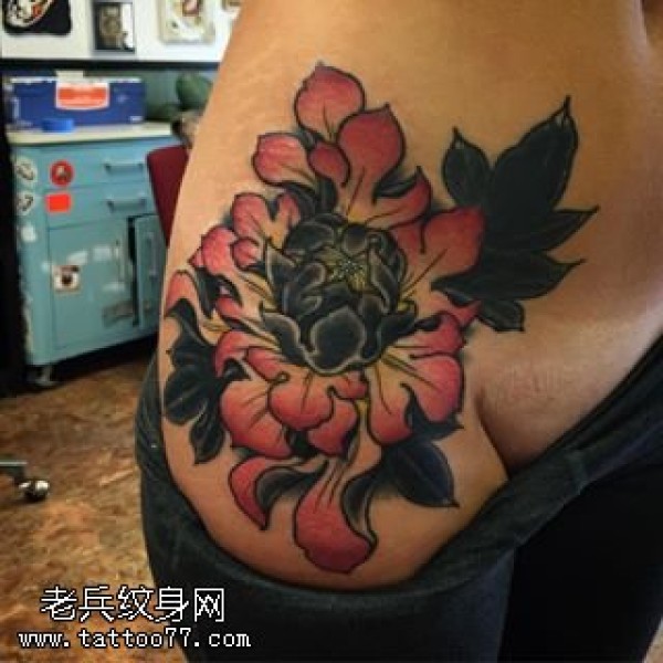 肩部的黑牡丹纹身图案