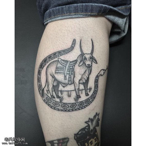 小腿的牛蛇纹身图案
