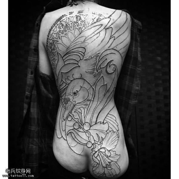 背部点刺的天鹅纹身图案