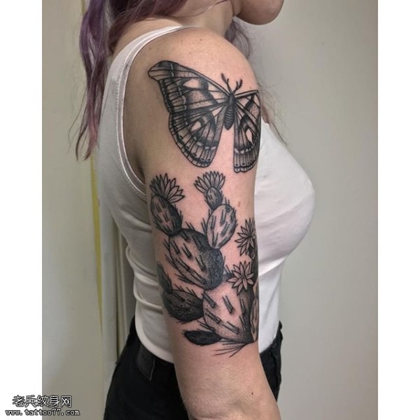 肩部的蝴蝶仙人掌纹身图案