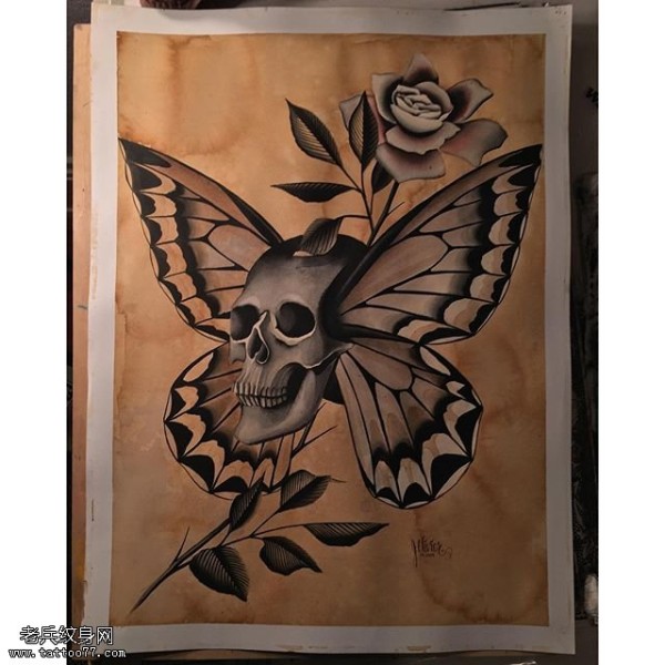 手稿骷髅蝴蝶纹身图案
