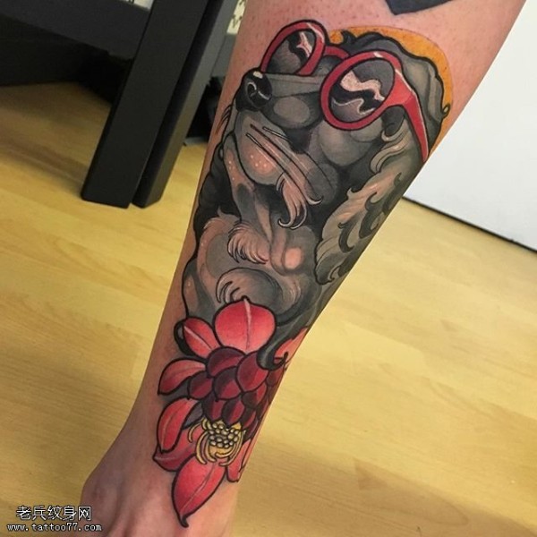小腿的狗狗牡丹纹身图案