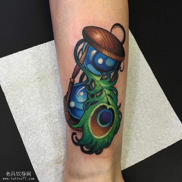 腿部彩绘沙漏纹身图案