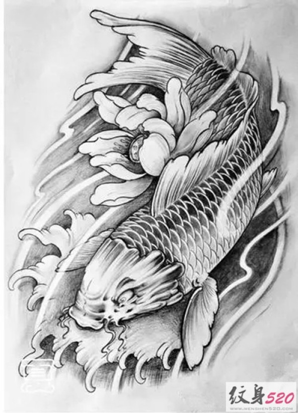 鲤鱼莲花纹身手稿