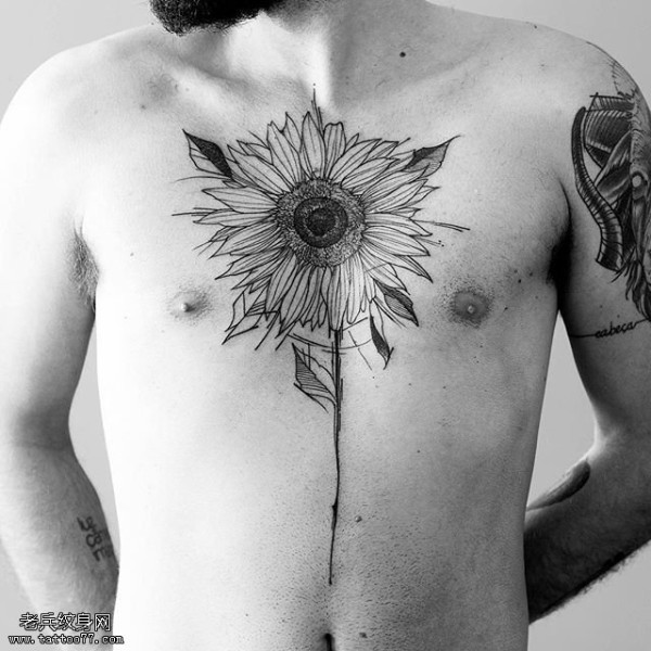 胸前的线条向日葵纹身图案