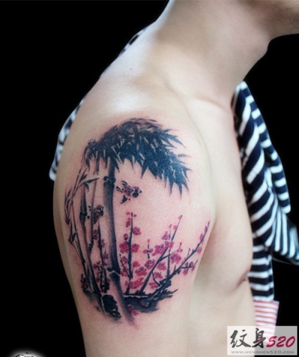 后肩唯美花藤英文图案图片_植物纹身图案大全_纹身图吧