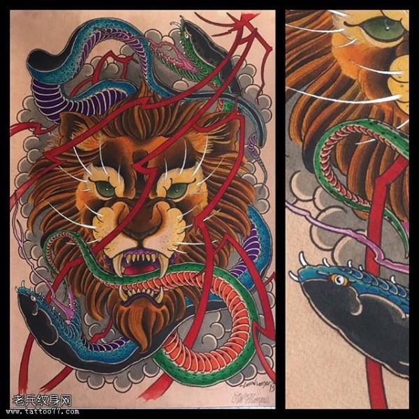 手稿狮子蛇纹身图案