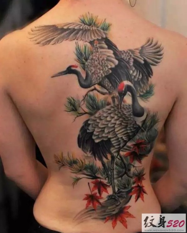 精美的满背丹顶鹤纹身图案