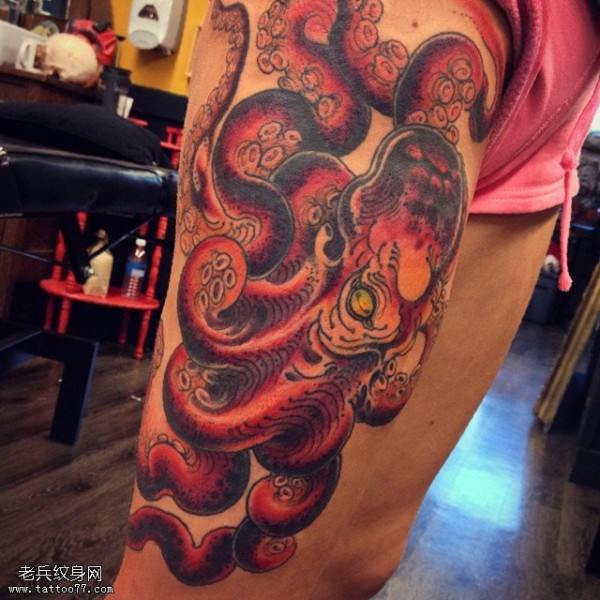 大腿的红章鱼纹身图案