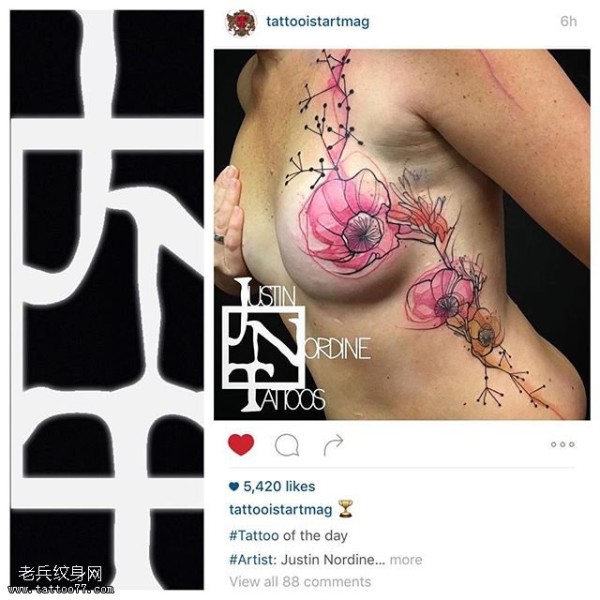 咪咪上的花卉纹身图案