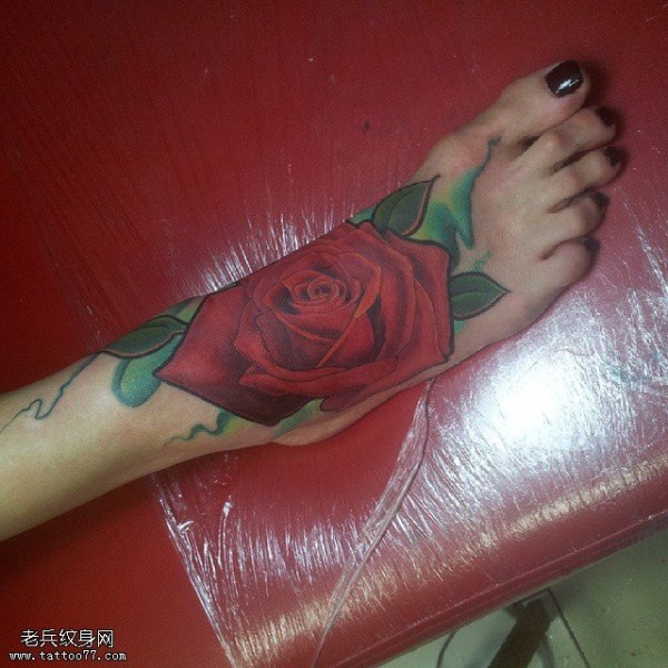 脚面写实的玫瑰纹身图案