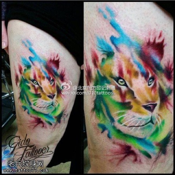 大腿水彩的老虎纹身图案