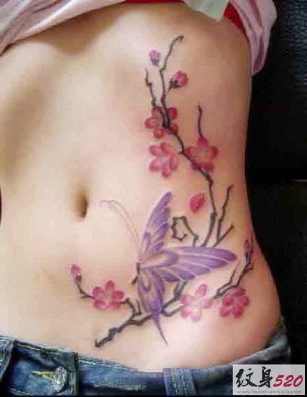 分享一款腰部时尚性感的蝶恋花纹身图案_腰部纹身图案大全_纹身图吧