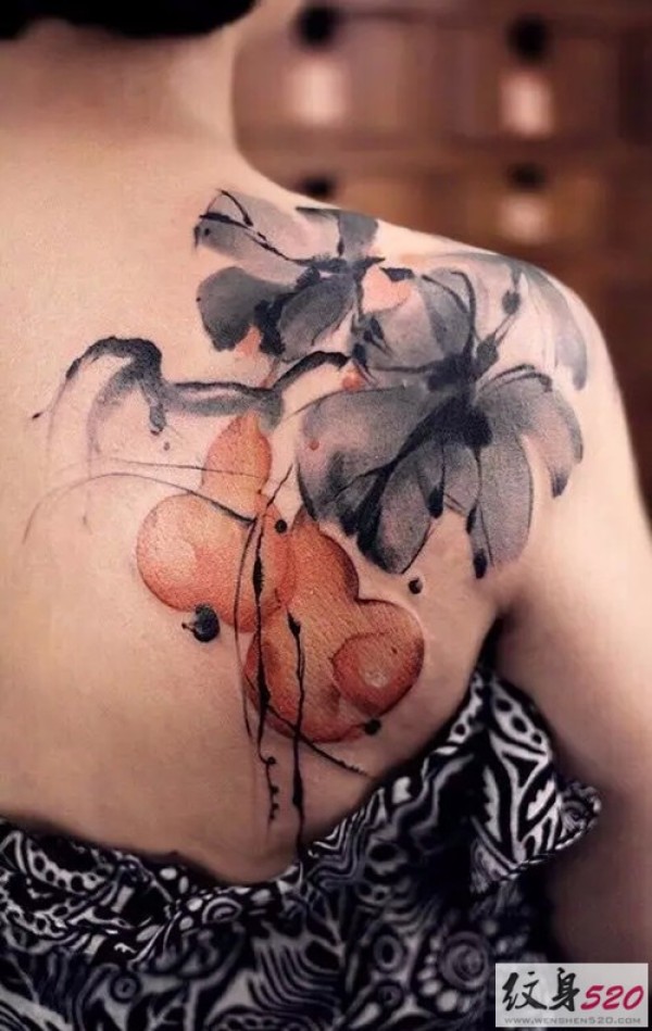女生肩花纹身_15张女性双肩对称的肩花纹身图案作品图片