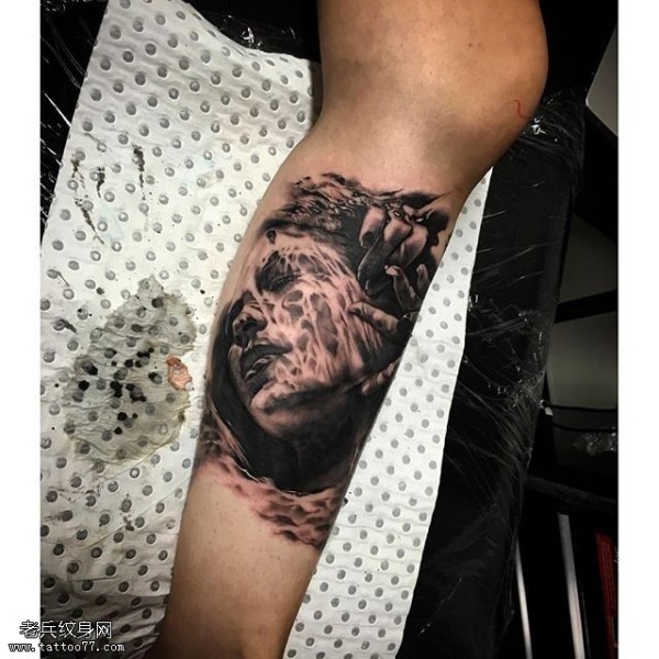 小腿的水墨肖像纹身图案