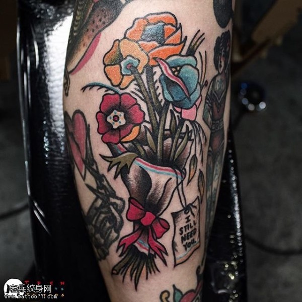 小腿经典花卉纹身图案