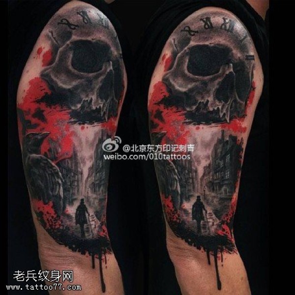肩部的骷髅风景纹身图案