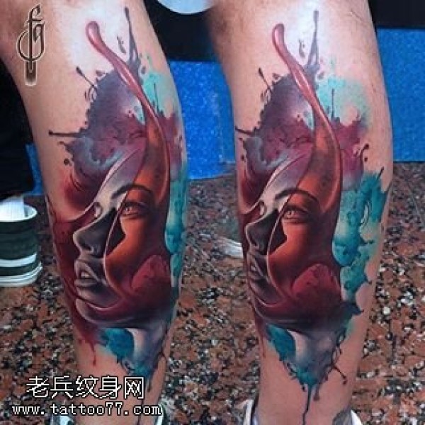 小腿水彩肖像纹身图案