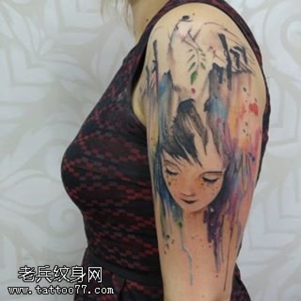 肩部水墨小女孩纹身图案
