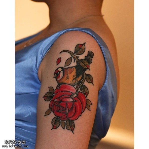 肩部的玫瑰鸟儿纹身图案