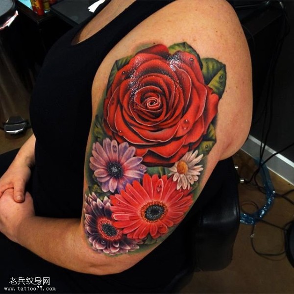 肩部娇艳的花卉纹身图案