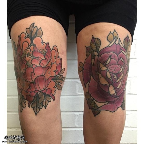 腿部的牡丹玫瑰纹身图案