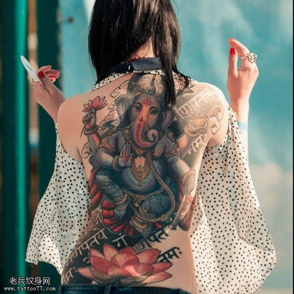背部的象神莲花纹身图案
