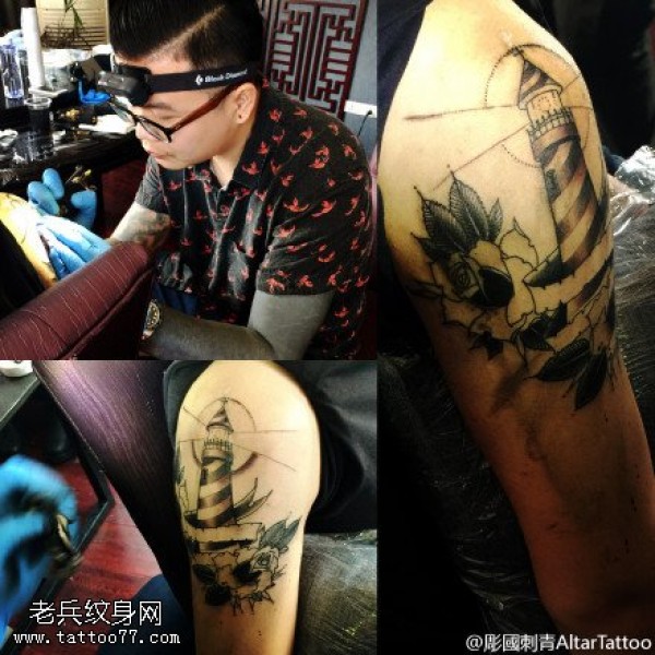 肩部的灯塔纹身图案