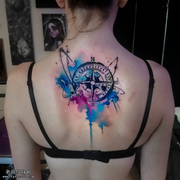 背部水墨的指南针纹身图案