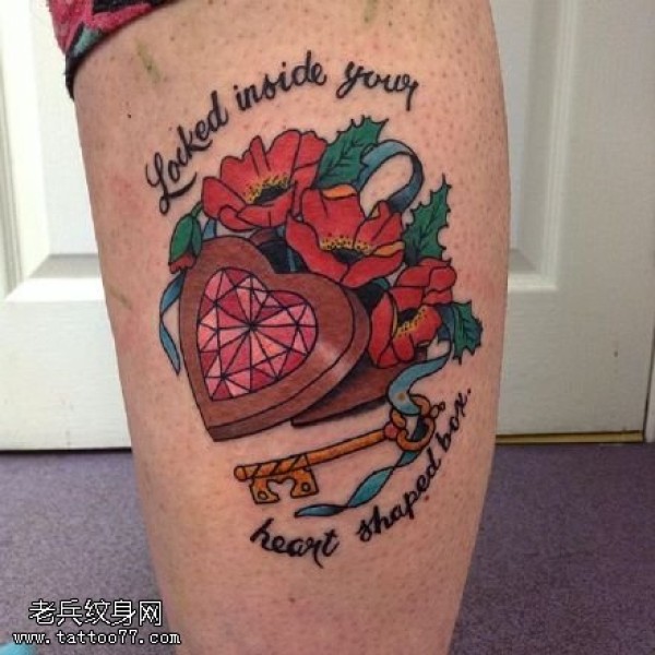 小腿的心形红宝石纹身图案