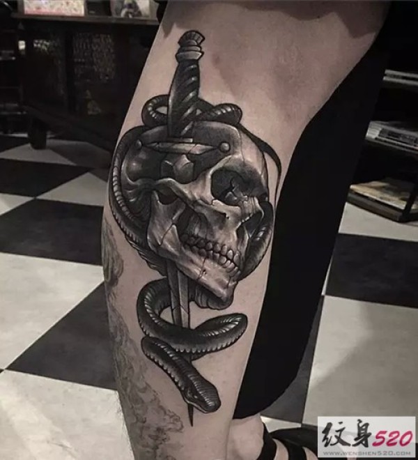 超帅时尚的黑灰骷髅与蛇纹身图案