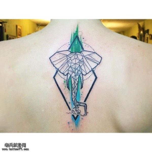 背部点刺线条大象纹身图案