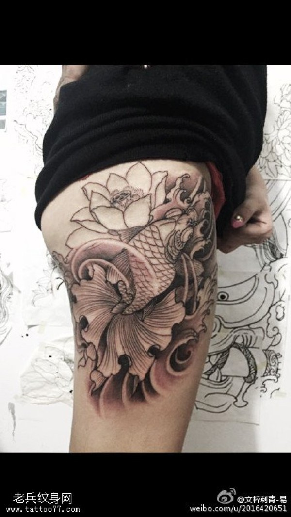 传统鲤鱼花小腿纹身_腿部纹身图案大全_纹身图吧