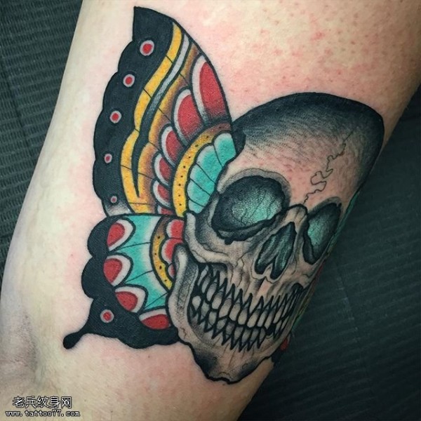 大腿的蝴蝶骷髅纹身图案