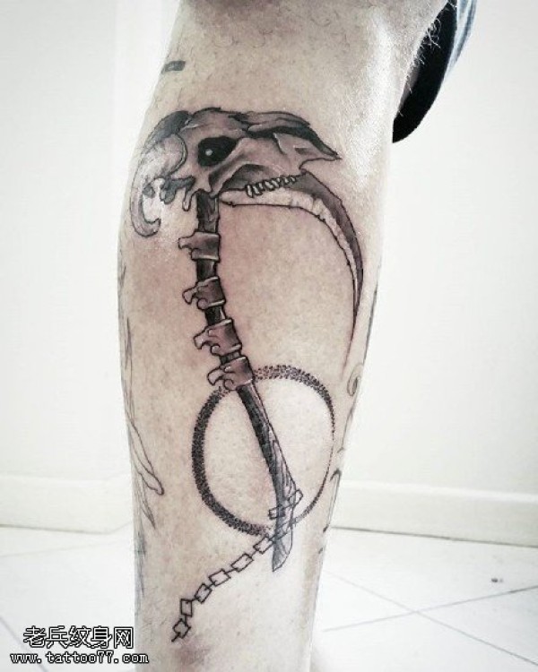 小腿上的骷髅镰刀纹身图案