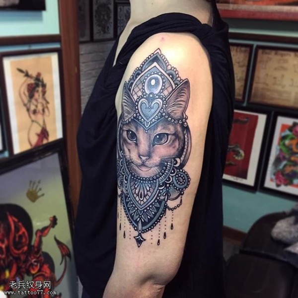 肩部梵花猫咪纹身图案