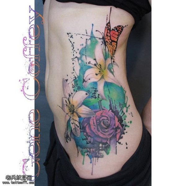 分享一款腰部时尚性感的蝶恋花纹身图案_腰部纹身图案大全_纹身图吧