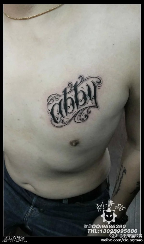 胸前花体字符纹身图案