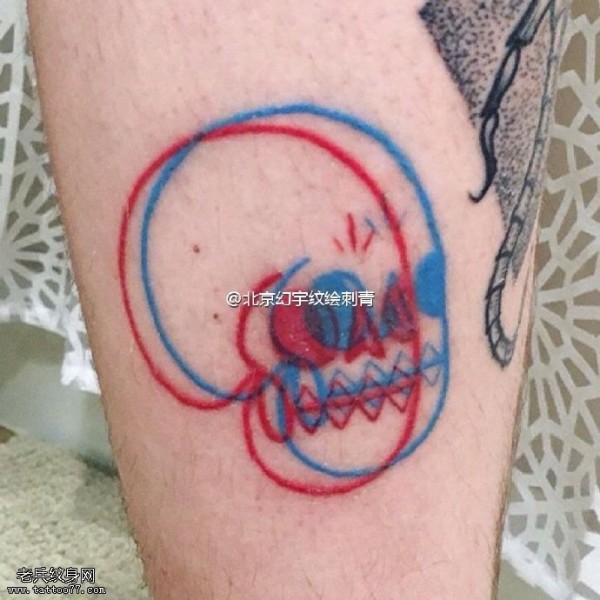 腿部线条点刺骷髅纹身图案