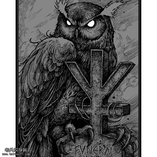 手稿十字架猫头鹰纹身图案