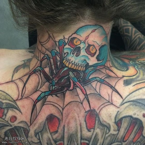 颈部的蜘蛛骷髅纹身图案