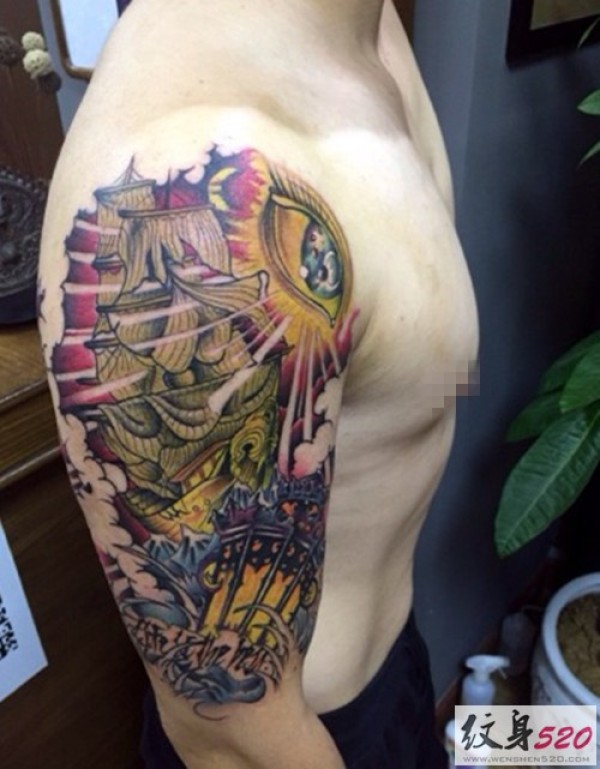 男士手臂复古帆船纹身