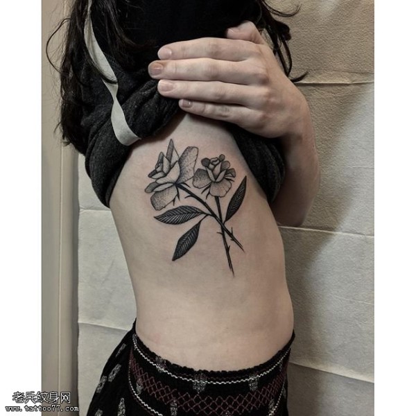 腹部两只玫瑰纹身图案
