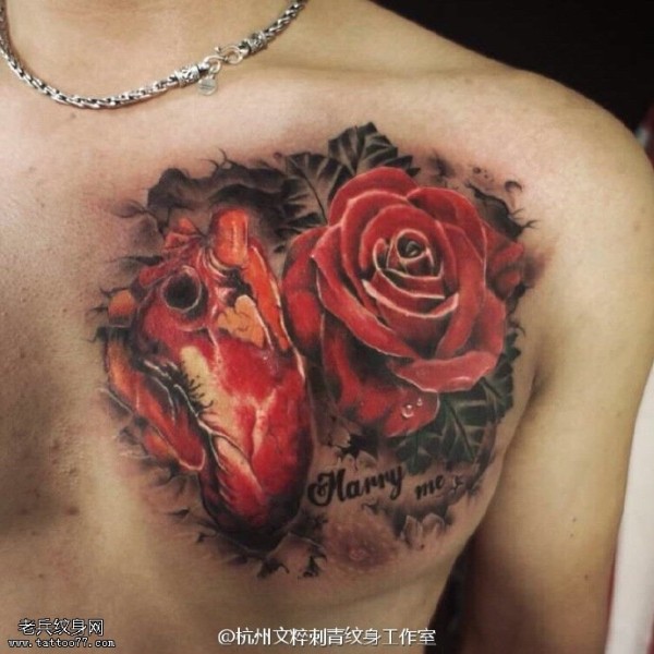 肩部的心脏玫瑰纹身图案