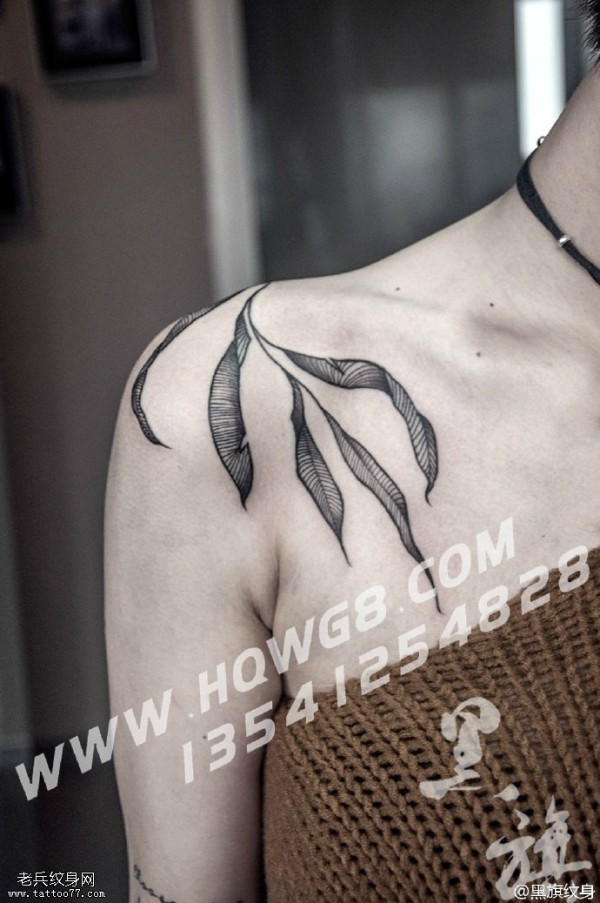 肩部的一枝柳叶纹身图案