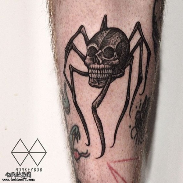 小腿的蜘蛛骷髅纹身图案